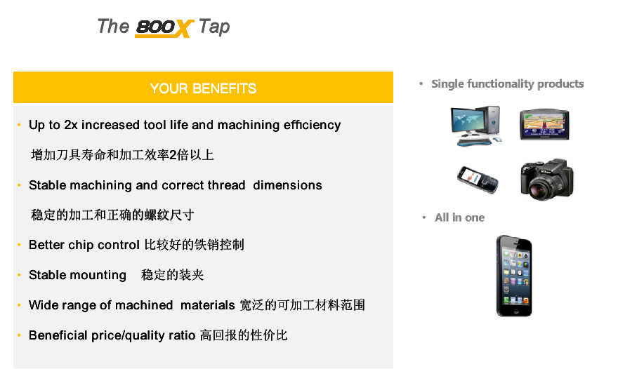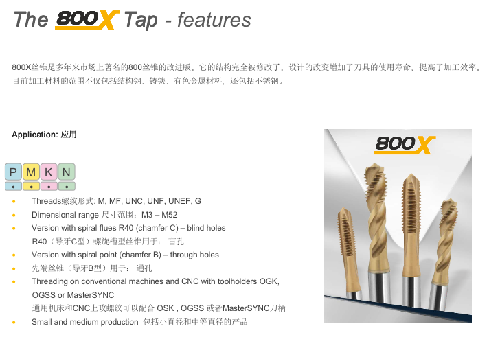 800X絲錐是多年來市場上著名的800絲錐的改進版。它的結構完全被修改了。設計的改變增加了刀具的使用壽命,提高了加工效率。目前加工材料的范圍不僅包括結構鋼、鑄鐵、有色金屬材料,還包括不銹鋼。