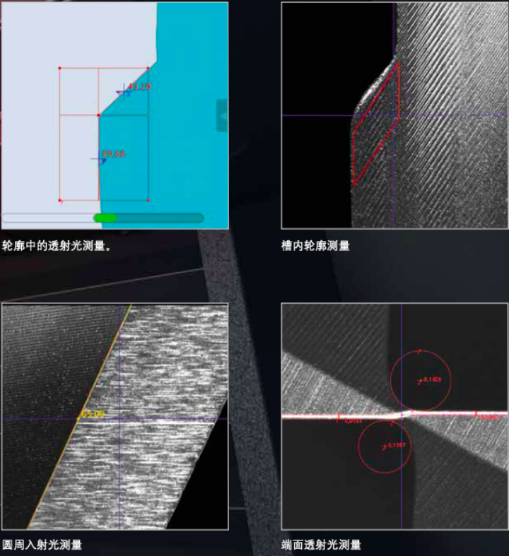 用于檢查和測(cè)量圓周、槽結(jié)構(gòu)和端面上的刀具幾何形狀。只需在測(cè)量程序 對(duì)話框中輸入目標(biāo)參數(shù),即可自動(dòng)測(cè)量并記錄每個(gè)變量:前角、后角、槽形和倒角寬度。八個(gè)大功率 LED 燈可以分別控制,并在自動(dòng)強(qiáng)度調(diào)節(jié)的幫 助下為切削刃提供最佳照明。