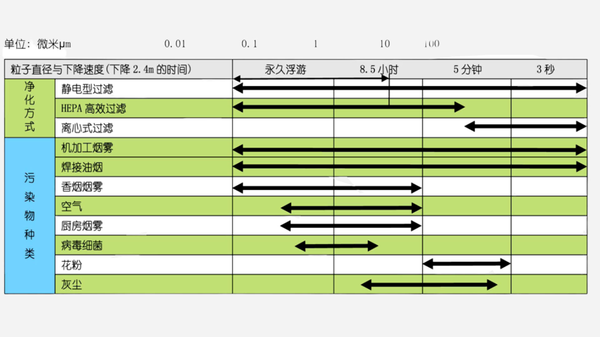 污染物微粒的大小與各類空氣凈化器的凈化范圍