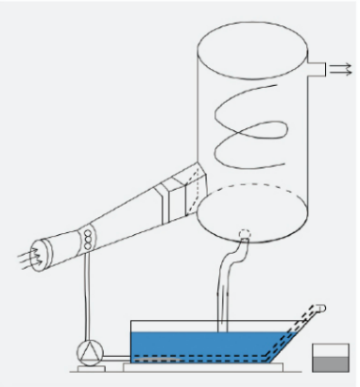 含雜質(zhì)氣體首先通過(guò)管道系統(tǒng)進(jìn)入集塵器收縮腔,氣速逐漸增加,在喉管有一個(gè)噴淋區(qū)域,水滴被急速通過(guò)的氣流高度霧化,由 此形成一個(gè)均勻的水霧簾將粉塵潤(rùn)濕,塵粒與水滴或塵粒之間發(fā)生激烈的碰撞和凝聚。之后氣體進(jìn)入擴(kuò)散腔,氣流速度降低,靜壓回升,以塵粒為凝結(jié)核的凝聚作用加快。凝結(jié)有水分的顆粒繼續(xù)凝聚碰撞,小顆粒凝結(jié)成大顆粒,一部分由于失重被捕捉,另一部分被分離器外殼利用離心力的力量分離出來(lái),使氣體得以凈化。被分離出來(lái)的粉塵則沉積下來(lái)經(jīng)過(guò)垃圾處理系統(tǒng)輸送出來(lái)。