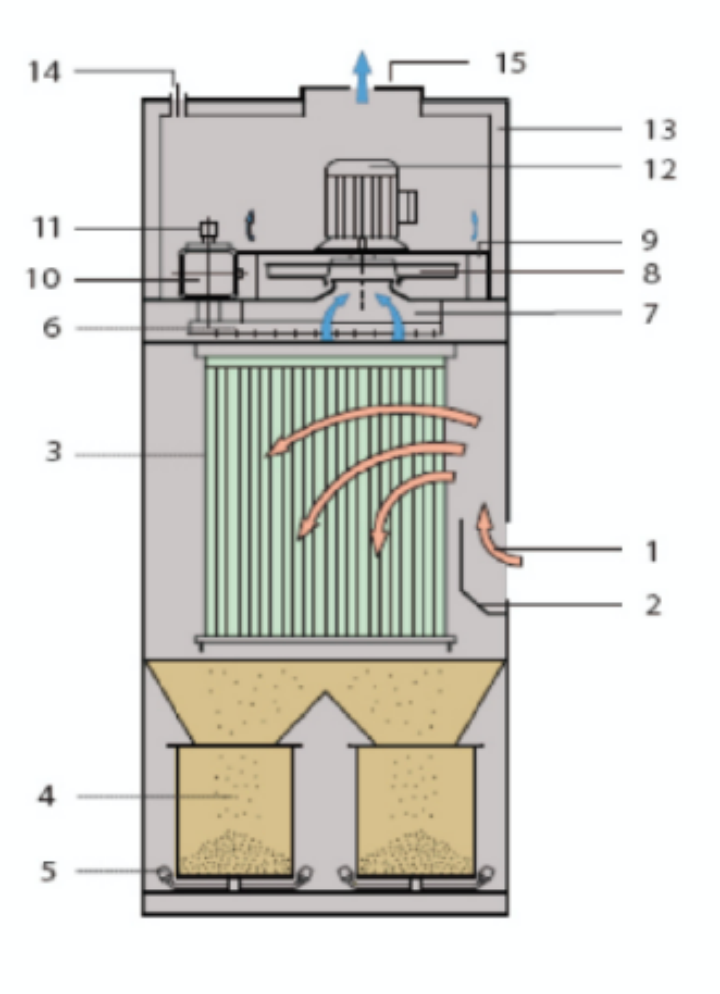 原氣(含塵氣體)通過(guò)進(jìn)風(fēng)口進(jìn)入除塵設(shè)備,經(jīng)過(guò)導(dǎo)流板后被減速并改向,此外還在各濾芯之間形成一個(gè)下沉式氣流,同時(shí)這還有助于粉塵的沉積,含塵氣體穿過(guò)濾芯后粉塵顆粒會(huì)被分離阻隔在濾芯表面。在整個(gè) 運(yùn)行過(guò)程當(dāng)中,可通過(guò)壓縮空氣脈沖反吹對(duì)粘附了粉塵的濾芯進(jìn)行反吹清洗,反吹之后粉塵顆粒會(huì)沉降在灰桶 中,這部分粉塵可以回收利用。凈氣(過(guò)濾后的干凈空氣)自上部排出主機(jī)。