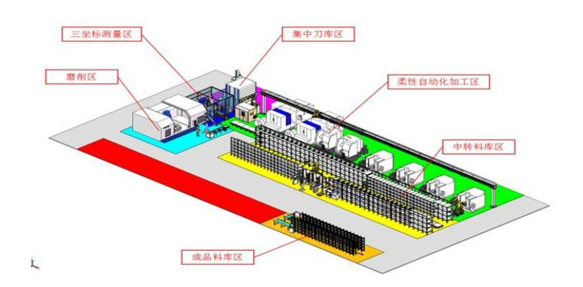 ? 刀具通過(guò)桁架從集中刀庫(kù)運(yùn)輸至機(jī)床