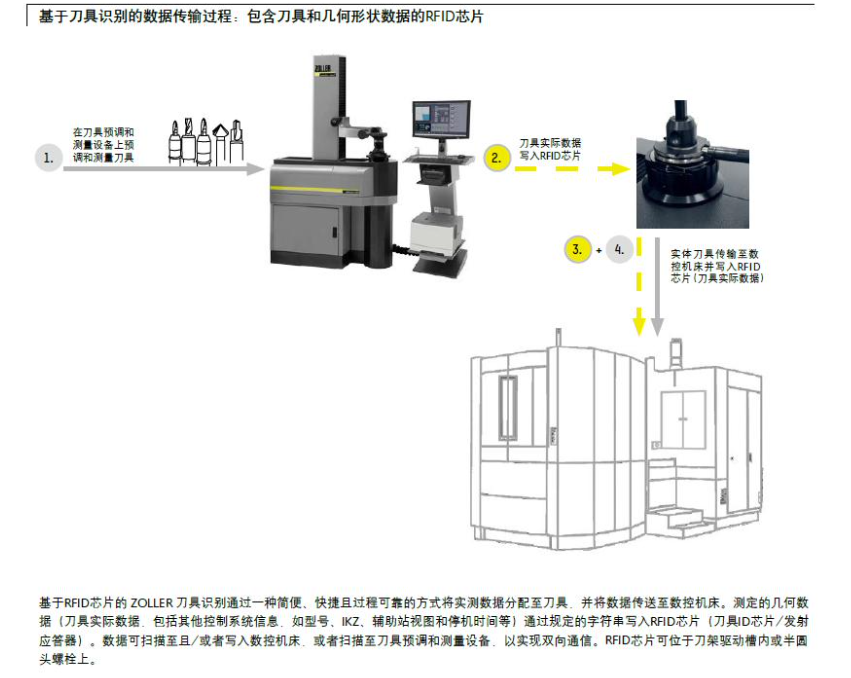 ? 機(jī)床讀取刀具RFID芯片內(nèi)容,將刀具測(cè)量數(shù)據(jù)及壽命信息寫(xiě)入機(jī)床數(shù)控系統(tǒng)